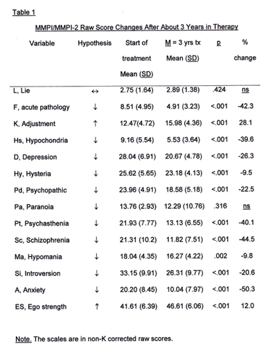 1.The MMPI/MMPI-2 should be significantly reactive to personality changes in long-term psychoanalytic psychotherapy. The scales assessing psychopathology, (F, Hs, D, Hy, Pd, Pa, Pt, Sc, Ma, Si, and A), should decrease after years of treatment. The K and Ego strength scales, both measuring psychological maturity, should increase after years of treatment.